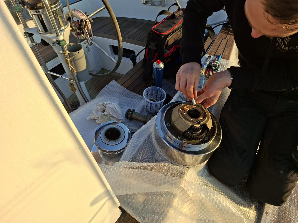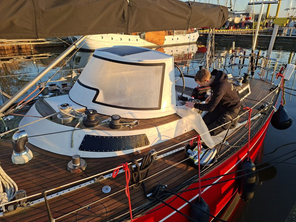 Nu is ze terug voor wat aandacht en service. We gaan aan de slag met de lieren en we pakken enkele kleine schades aan, zodat de boot weer in optima forma kan beginnen aan het vaarseizoen.